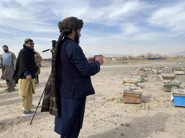 The image depicts an outdoor scene in Nakhonay, Afghanistan, featuring four males and a field of beehives under a partly cloudy sky