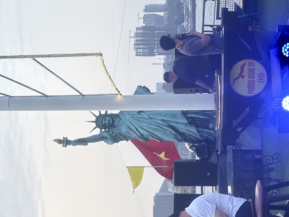 The image depicts an outdoor event scene, likely on a floating platform or waterfront in Hong Gai Ward, Vietnam. A prominent, blue-green patinaed replica of the Statue of Liberty stands in the center-left, holding a torch in its raised right hand and a tablet in its left. Behind the statue, a large red Vietnamese flag with a yellow star is visible, alongside a smaller yellow triangular flag to its left. A tall white mast runs vertically through the center of the frame, partially obscuring the statue and the background. Three men are present on the platform. On the far left, a person wearing a white short-sleeved shirt is partially visible, seated on a dark stool next to a small, ornate metal table. In the center-right, a man in a dark short-sleeved shirt operates sound mixing equipment on a dark platform. To his right, a second man in a grey t-shirt and sunglasses holds a microphone in his right hand, facing towards the left. Two black d&b audiotechnik speakers are positioned on the deck. The sound equipment platform features a circular sign displaying "PHƯƠNG HOÀNG VIP 99" with a bird emblem, and blue stage lights illuminate the area from the foreground. In the background, across a body of water, a city skyline with multiple buildings, some under construction with visible cranes, extends towards distant hills. The sky is overcast and light grey.