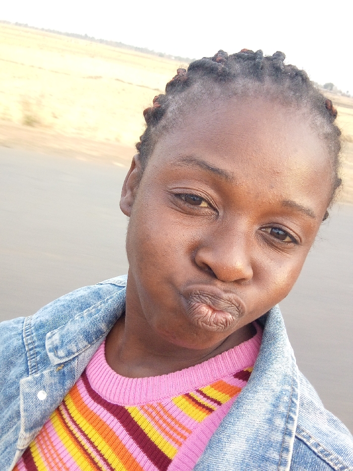 A young woman with dark skin puckers her lips in a kissy face. She has a braided hairstyle and is wearing a bright, diagonally striped sweater with pink, yellow, orange, and burgundy colors. Over the sweater, she has on a light denim jacket. The background shows a slightly blurred landscape in soft, neutral tones, indicating a possibly outdoor setting.