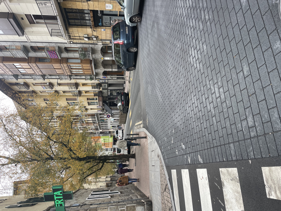 This image captures a street scene in Eibar, Spain, on an overcast day. The foreground features a pedestrian crosswalk with white stripes on a black asphalt patch, leading onto a grey paver-stone street surface that appears damp. The street curves slightly to the right and recedes into the background. On the left, a paved sidewalk runs parallel to the street. Multiple pedestrians are observed walking away from the camera; the most prominent are a female in a brown jacket and a male in a light-colored jacket. A tall, deciduous tree with yellow-orange foliage stands on the sidewalk, its branches extending towards the street. An adjacent stone building on the left exhibits a green LED pharmacy cross sign, partially displaying "ERTA". Parked vehicles line both sides of the street in the midground. A dark blue Citroën C4 Picasso (Spanish license plate 0726 HFG) is positioned curbside on the right, partially obscuring a silver sedan behind it. Further down the street on the left, a dark-colored sedan is parked. The right side of the street is flanked by a continuous row of multi-story buildings, characterized by varied architectural styles and facade colors including yellow, beige, and white. These structures feature numerous balconies and some wooden bay windows. Ground-level storefronts are visible, one labeled "BIKANAK," where a person is observed near the entrance. A balcony on one building displays a red, blue, and red striped banner. Additional buildings and vehicles are present further down the street in the background.