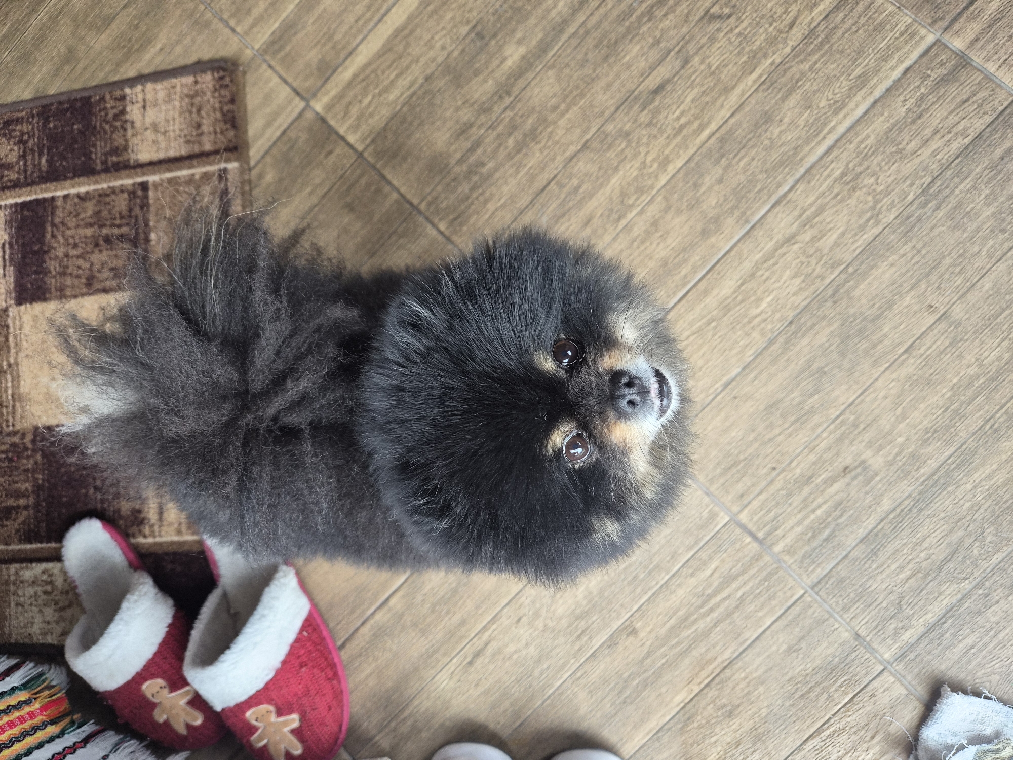 An indoor scene in Stamboliyski, Bulgaria, displays a black and tan Pomeranian dog situated on a light brown, wood-effect tiled floor. The dog is positioned centrally, facing directly towards the observer, with its mouth slightly open, revealing its lower teeth. Its fur is dense and appears recently groomed, with prominent ear tufts and a bushy tail visible at the rear. In the upper left background, a pair of red house slippers with white faux fur lining and a light brown gingerbread man appliqué on each are partially visible. Adjacent to the slippers and partially beneath the dog's rear is a rectangular brown rug with a striped pattern. A fragment of a multicolored woven textile, featuring red, yellow, and green threads, is visible in the extreme upper left. In the lower left corner, a small, crumpled white cloth is present on the tiled floor.