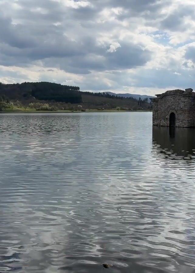 lake with an old, stone building partially submerged in the water. The building has a visible archway and several window or door openings. It appears to be in a state of disrepair, but still stands firmly in the water. The lake is surrounded by greenery including distant hills and trees, with a cloudy sky above. The water is slightly rippled, reflecting the sky and the building. There are no people or animals visible in the scene. The camera remains stationary throughout the video.