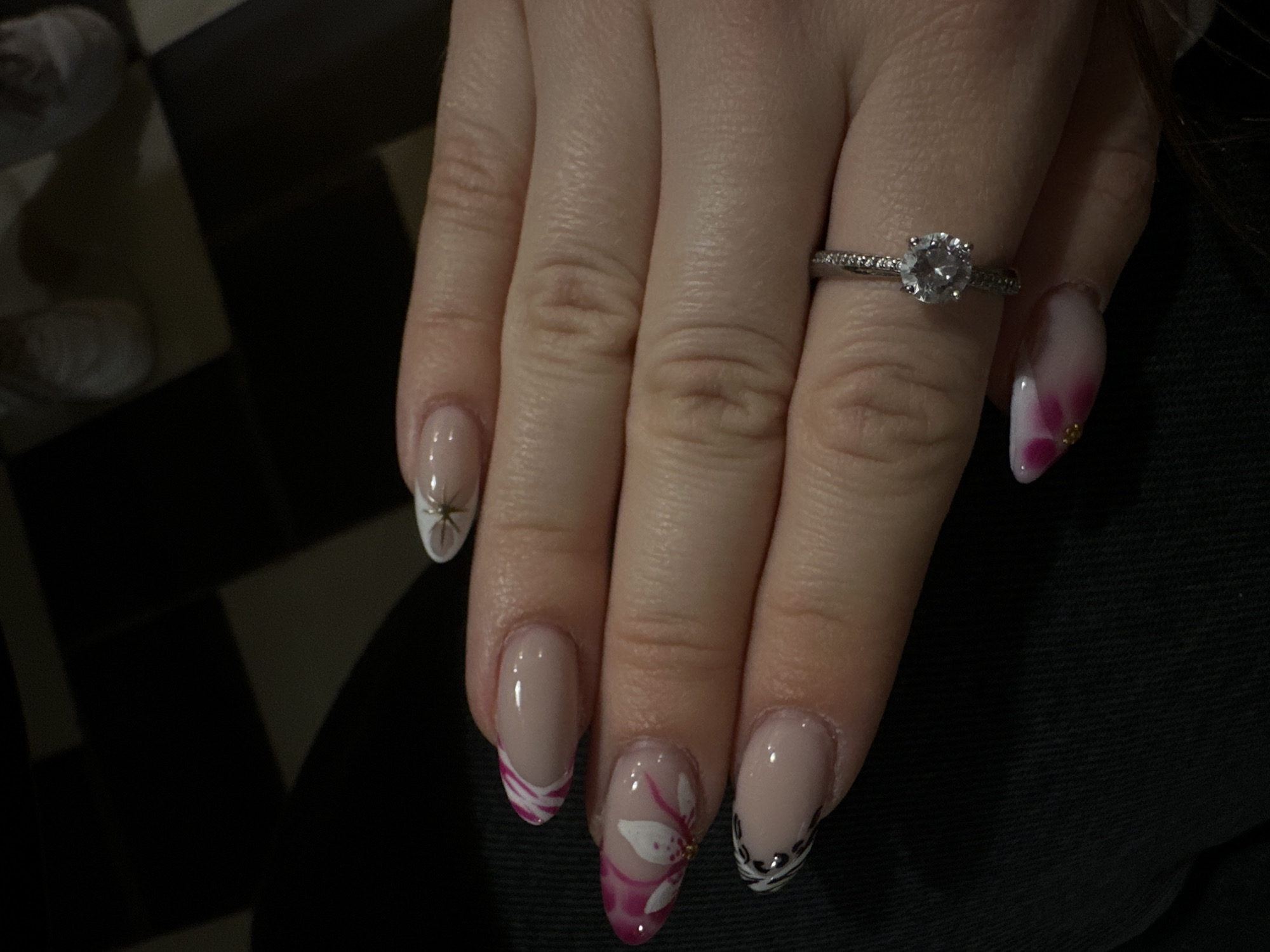 The image displays a close-up, downward-angled view of a human left hand, specifically the dorsal side, located in the city of Tutrakan, Bulgaria. The hand exhibits manicured nails featuring a natural pink/nude base with distinct designs on each tip: the thumb tip is white with a gold starburst pattern, the index finger tip is white with pink stripes, the middle finger tip is pink with a white floral design and a small gold embellishment, the ring finger tip is white with a black animal print, and the pinky finger tip is pink with gold accents. A silver-toned ring, set with a single large, round, brilliant-cut clear gemstone secured by four prongs, and a band encrusted with smaller stones, is worn on the ring finger. The hand rests against a dark, likely black, textured fabric object, partially visible in the lower left portion of the frame. The background, out of focus, includes a black and light-colored checkered pattern to the upper left, and blurred light-colored footwear with an indistinct light surface to the upper right, suggesting an indoor environment. No specific active interactions are depicted beyond the wearing of the ring and the static presentation of the hand.