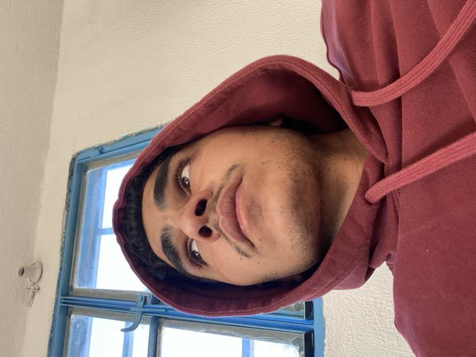 An upward-angled close-up depicts a young male within an interior setting in Dahiyat Harasta, Syria. The subject, positioned centrally, is observed from the chest up, wearing a maroon hooded sweatshirt with the hood drawn over his head. He possesses dark hair, thick eyebrows, dark eyes, and a light mustache with stubble on his chin and cheeks. His gaze is directed upwards and to the right of the frame, with his mouth slightly parted. To the upper left and behind the subject, a window with distressed blue-painted wooden frames is visible, admitting ambient light. Above the window, on the textured white ceiling, a small, white, exposed electrical light fixture base is present, affixed near a patch of peeling paint. The wall to the subject's right is also white and textured.