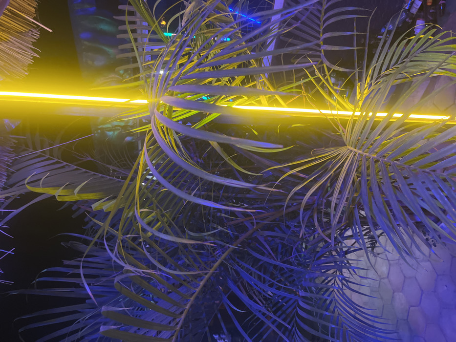 Palm fronds dominate the scene, their leaves exhibiting a range of blues and greens under vibrant yellow lighting