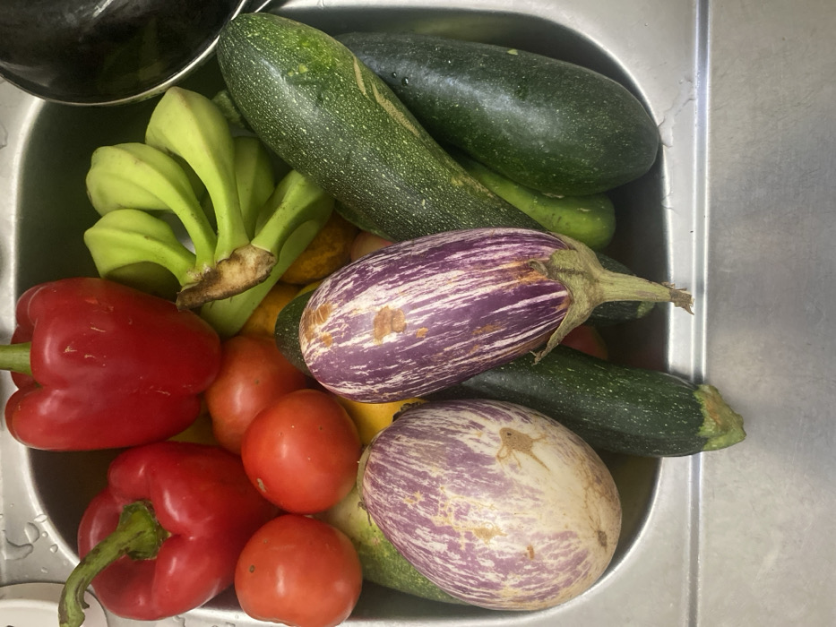 A stainless steel kitchen sink, located in Capesterre-Belle-Eau, France, contains a collection of unwashed produce. The arrangement includes two red bell peppers with green stems, three red tomatoes, and a bunch of green, unripe bananas. Centrally positioned are two oblong eggplants, displaying purple and white striations with scattered brown blemishes. At least four dark green, speckled zucchinis or large cucumbers are visible, alongside indistinct yellowish produce partially obscured beneath the main items. Water droplets are present on the stainless steel surface of the sink.