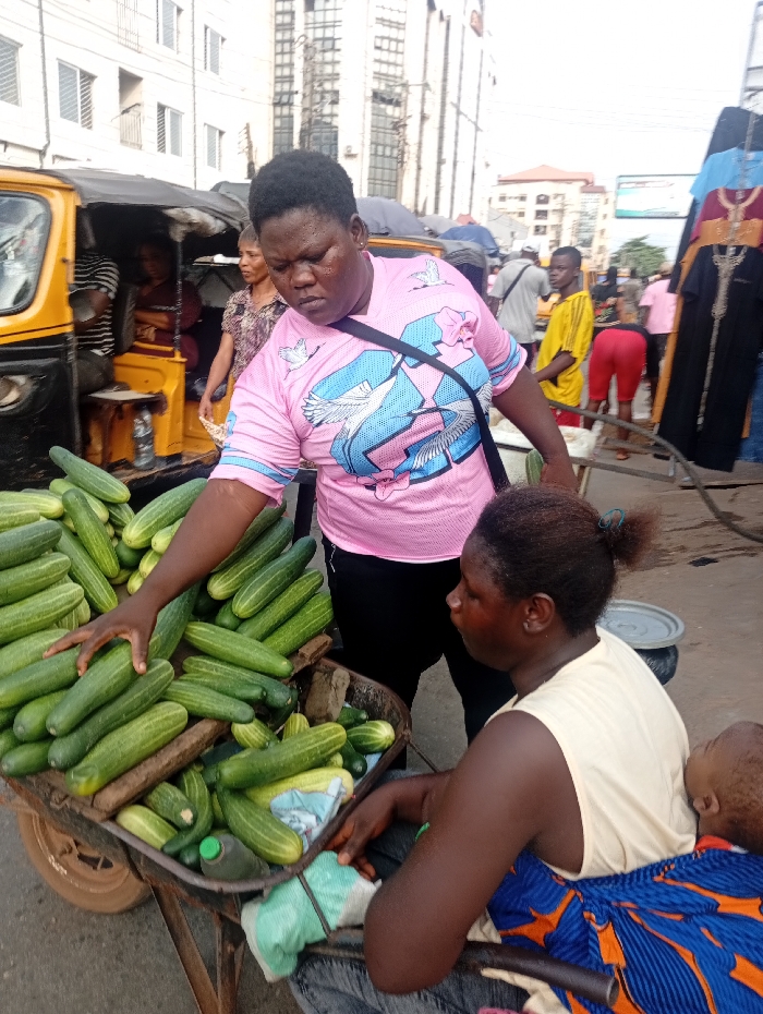 A bustling street market scene in Onitsha, Nigeria, captures a transactional interaction between two women. In the foreground, a dark-skinned woman wearing a pink t-shirt with a blue graphic depicting two white cranes/herons in flight and black pants stands over a metal wheelbarrow filled with green cucumbers. She wears a black cross-body strap over her left shoulder. Her right hand rests on the stack of cucumbers, appearing to arrange or present them. Her facial expression is focused. To her right and slightly lower, another dark-skinned woman sits or squats, facing left in profile. She wears a light-colored, possibly beige, sleeveless top. A baby, with a visible head and light-colored hair, is secured to her back with a patterned blue and orange fabric wrapper. Her left arm rests on the edge of the cucumber-laden wheelbarrow. The wheelbarrow, constructed of dark metal, holds a large quantity of fresh, green cucumbers, piled high. A smaller cluster of cucumbers and a green plastic bottle are visible deeper within the wheelbarrow. In the mid-ground, a yellow motorized tricycle, commonly known as a Keke Napep, is parked. People are visible inside and around it, including one individual in a striped shirt. Beyond the tricycle, a multi-story building with white exterior walls and numerous windows dominates the background. Other individuals, primarily men in casual attire, are scattered throughout the background, indicating a busy urban environment with additional market stalls, including one displaying clothing on hangers to the right. The ground appears to be a paved surface. The lighting suggests daytime.
