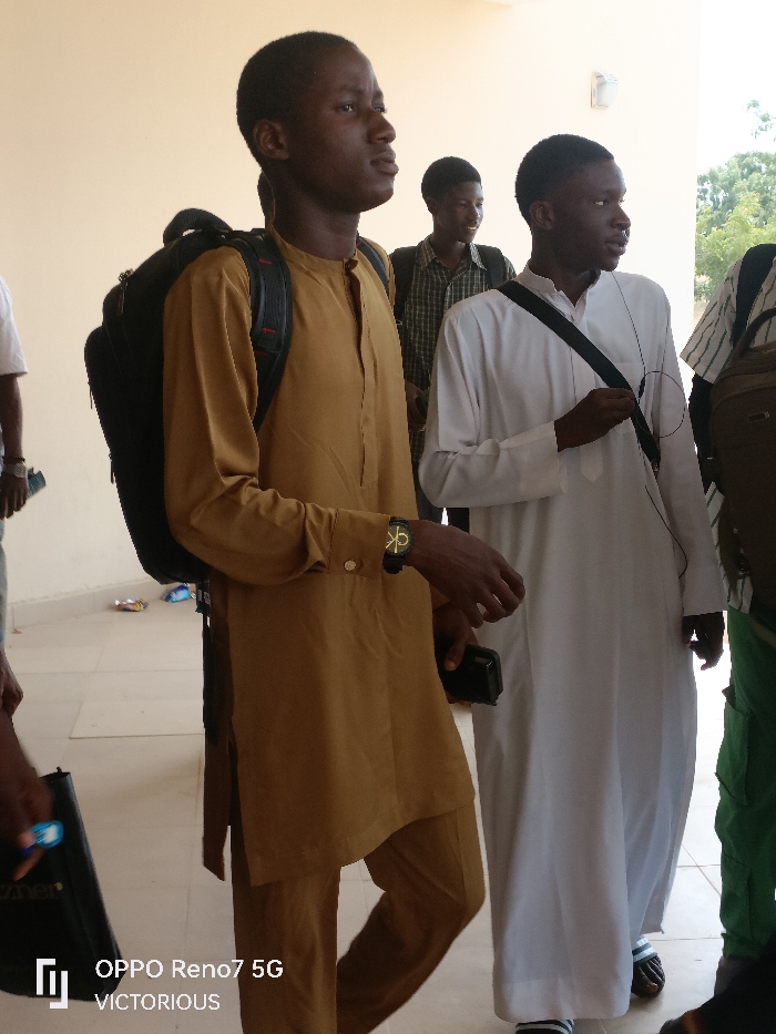 The scene is located in the city of Dutse, Nigeria, within what appears to be a brightly lit public building corridor or covered walkway