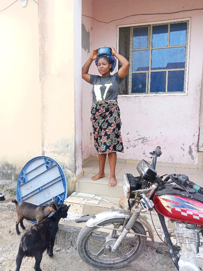 A young woman stands on a step with a blue pot on her head. She wears a gray t-shirt and a floral skirt. Behind her is a pink building with a blue-framed window. In front of her is a red motorcycle. Two goats are near a blue object to the left.