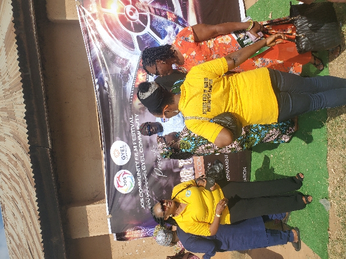 An outdoor scene in Barikin Gidar Kanat, Nigeria, depicts a gathering of approximately eight individuals in front of a promotional banner. The banner, hung against a light brown, possibly mud or concrete, building wall, features the text "JOS COMMUNITY FILM FESTIVAL" and "GYEL COMMUNITY" along with associated logos and graphics of film reels. A rusted corrugated metal roof is visible above the wall. In the foreground, a green artificial turf mat is placed on light brown soil. Several people are standing on or near this mat. Notable individuals include: * A woman in a yellow polo shirt, black trousers, and dark sunglasses, holding a black handbag, positioned to the left. * A man in a light-colored shirt and dark sunglasses, partially obscured behind others, smiling and looking forward. * A woman wearing a vibrant patterned dress and head wrap, facing left. * A woman with her back to the camera, wearing a yellow t-shirt that reads "ACTORS GUILD OF NIGERIA PLATEAU STATE CHAPTER" and dark jeans, carrying a black shoulder bag. * A woman in an orange patterned dress, dark-rimmed glasses, holding a black quilted handbag and a document, positioned to the right. The individuals are in various states of interaction, mostly standing and observing, suggesting an event or a photo opportunity. Natural daylight illuminates the scene.