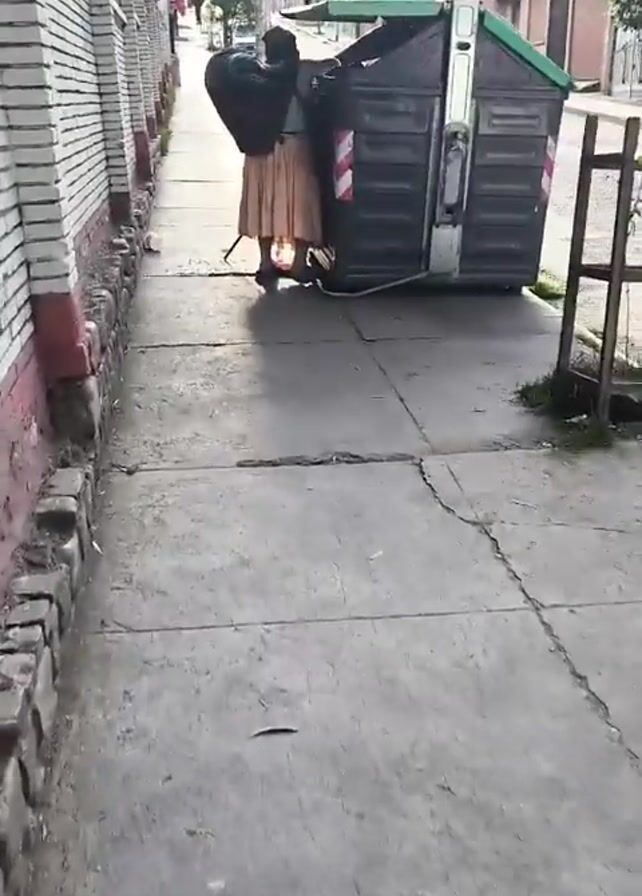 woman scavenging through a large, dark gray dumpster. She wears a long, tan-colored skirt, a light-colored top, and blue shoes, and carries a large, patterned bag on her back. She appears to be using a stick to rummage through the contents of the dumpster, which has a green lid. The scene takes place on a sidewalk between buildings in an urban area. The ground is cracked in places, and the buildings are varied in height and color. The video is somewhat shaky.
