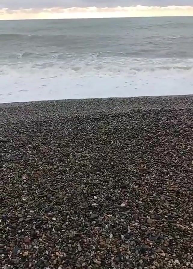 pebbled beach on an overcast day. The beach is covered in small, dark pebbles, and the waves from the sea reach the shore. The water is a grayish-green, and the sky is filled with gray clouds, with a small sliver of light visible near the horizon. There are no people or other objects visible in the video, the focus is on the natural scene of the beach and sea.