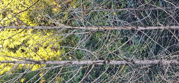 The image displays a natural landscape within the city of Esch-sur-Alzette, Luxembourg. Two slender, vertical deciduous trees with light gray-brown bark and a dense network of bare, intertwining branches occupy the foreground. The background consists of layered foliage: the upper section features bright yellow-green leaves, indicative of deciduous trees, while the lower section shows dense, darker green evergreen vegetation. The defoliated state of the foreground trees suggests a late autumn or winter season. No individuals, animals, or artificial structures are present within the frame. The scene is illuminated by natural daylight.