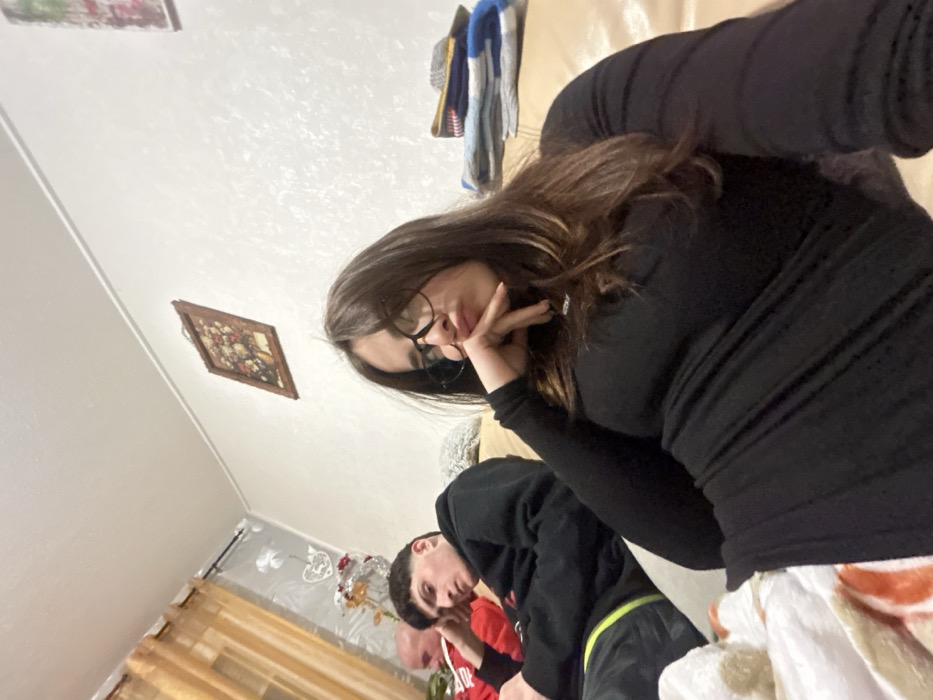 A woman with long brown hair and glasses is lying on a tan surface. She is wearing a black long-sleeved shirt and her hand is resting on her cheek. Beside her are two people: one wearing a red shirt and another wearing a black sweatshirt and gray shorts. A framed picture hangs on the white wall behind them. A set of folded blue and gray clothing rests on the tan surface behind the woman. The photo has been rotated slightly.