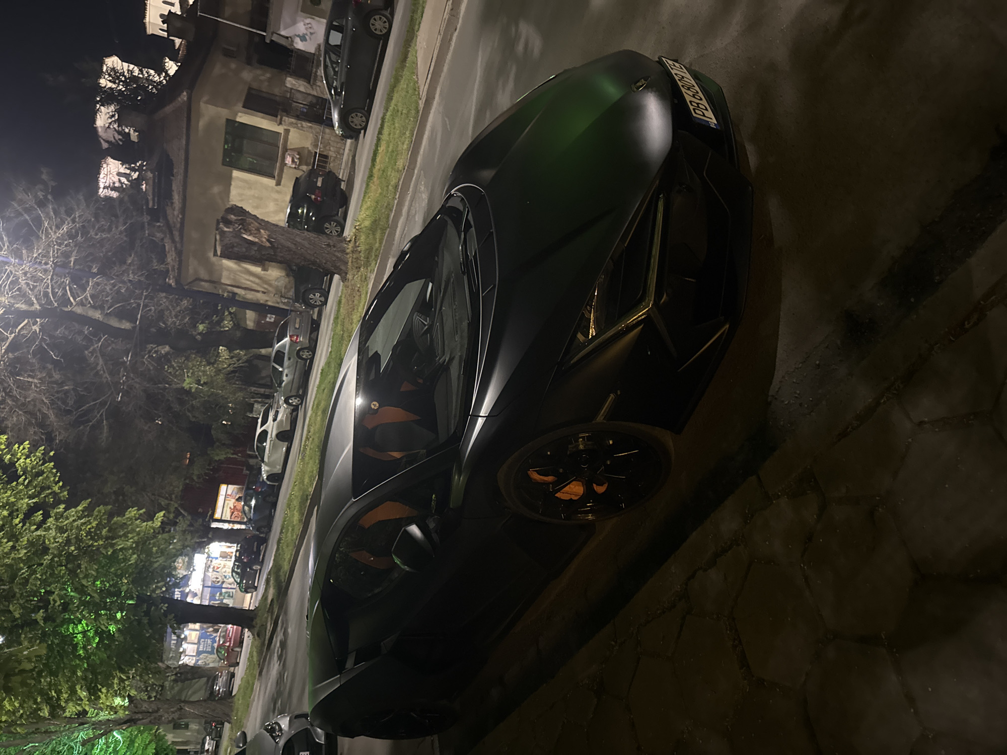 The image features a matte black Lamborghini sports car parked on a stone-paved street in Pazardzhik, Bulgaria, at night. The car's license plate is partially visible. The street is lined with buildings, some of which have lit windows. Several other cars are parked further down the street. Trees are visible along the road and on the sidewalk with lights along the tree. In the background, there is a building with advertisements in the window.