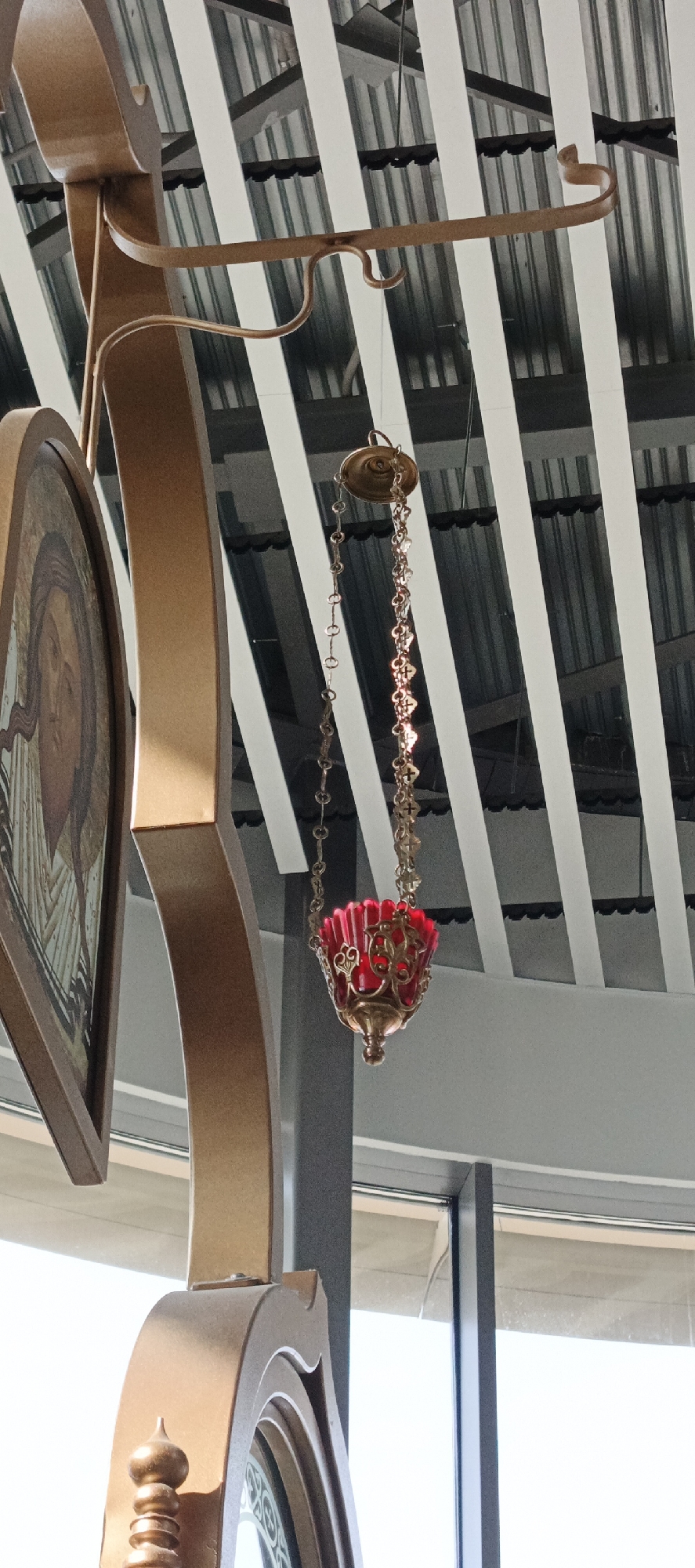 This image presents an indoor scene in Bolshoye Savino, Russia, featuring religious and architectural elements. On the left, a matte gold-colored, ornate arch structure is visible. Integrated into this structure on the far left is a framed Orthodox Christian icon, partially displaying the upper portion of a religious figure's face. A decorative, curved gold-colored metal arm extends from the upper part of the arch. Centrally, a red, ribbed vigil lamp encased in golden filigree hangs by a multi-link golden chain from a ceiling mount. Some links in the chain are shaped like crosses. The background consists of a corrugated metal ceiling with alternating dark and white diagonal structural beams. To the right, large windows with grey frames admit bright natural light, revealing a partially lowered window blind and a vertical grey structural column.