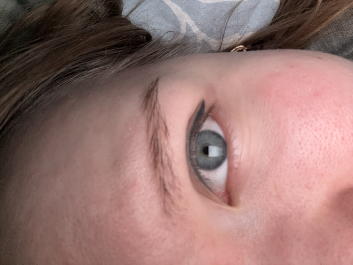 A close-up, tilted view of a face focuses on an eye and eyebrow. The eye, colored in a blue-grey hue, is framed with dark eyeliner. The eyebrow above the eye is shaped and filled in with a dark color. The skin appears fair with visible pores. Some brown hair is visible at the top of the frame, held back with a small, gold-colored hair tie. A fabric of a grey color, likely from the surface where the person is laying, is visible in the background.