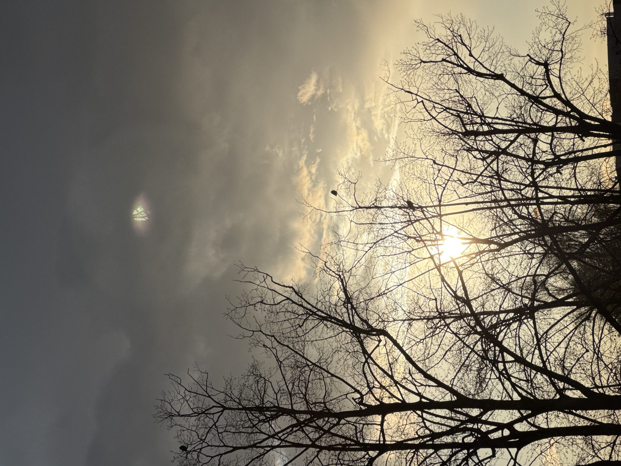 The image displays an outdoor scene in Strasbourg, France, at either sunrise or sunset. The lower half of the frame is primarily occupied by the dark, silhouetted forms of multiple deciduous trees, their bare branches stretching upwards against the illuminated sky. The sun, visible as a bright light source, is partially obscured by the tree canopy, particularly on the right side, casting a strong light and lens flare. The sky transitions from a dark, cloudy grey-blue in the upper portion to a bright, warm yellow-orange towards the horizon, interspersed with lighter clouds. Two dark, small birds are perched on individual bare tree branches: one in the upper left quadrant and another near the center-right. In the upper central portion of the sky, an oval-shaped, greenish light anomaly or reflection with a distinct internal fragmented pattern is present. The very bottom edge of the image reveals a faint, dark horizontal line, suggesting the outline of distant structures or the ground level beneath the trees.