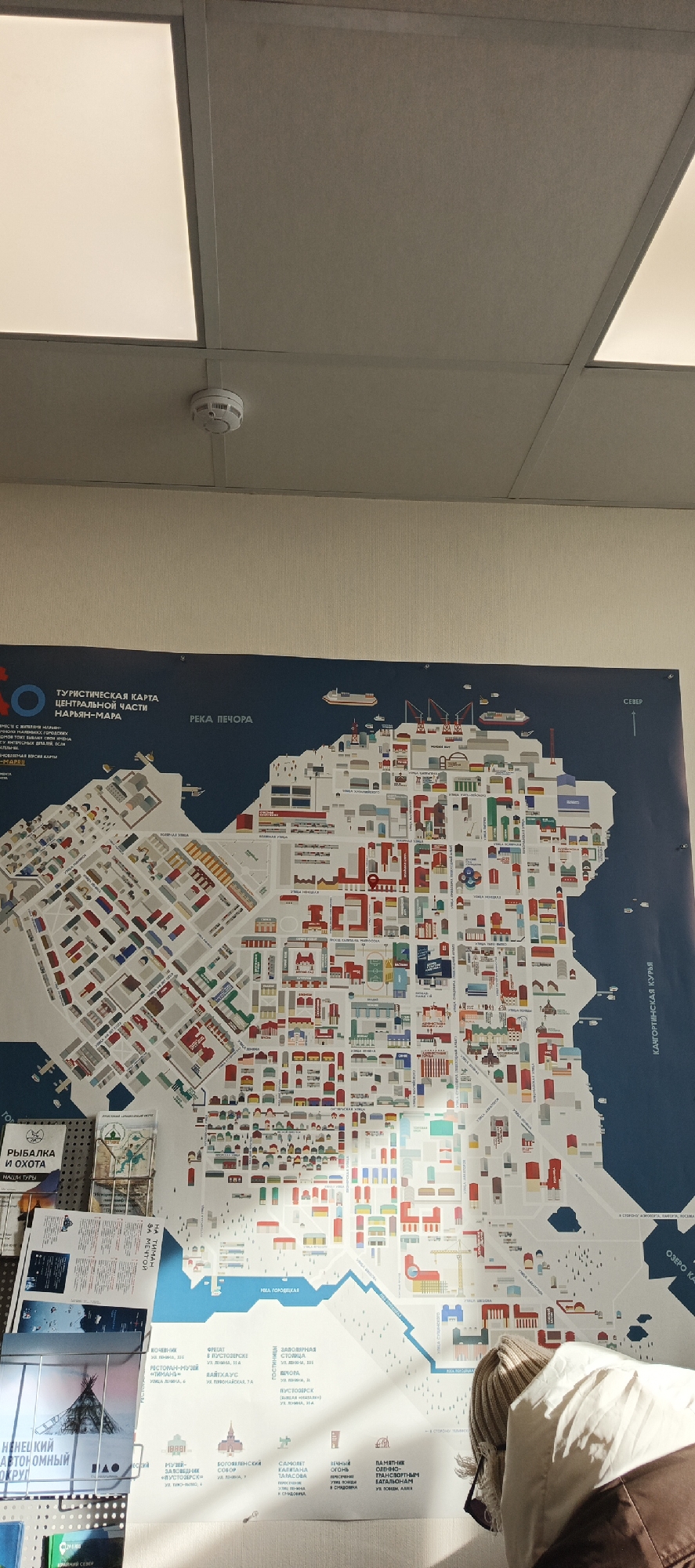tourist map of the central part of Nar'yan-Mar, Russia, pinned to a wall. The map is in Russian and features illustrations of buildings and landmarks, including the Pechora River. The map is titled "Tourist Map of the Central Part of Nar'yan-Mar". Below the map, there is a stand with brochures advertising fishing and hunting tours. A person's shoulder and the back of their head are visible in the lower right of the frame. Overhead are fluorescent ceiling lights and a smoke detector.