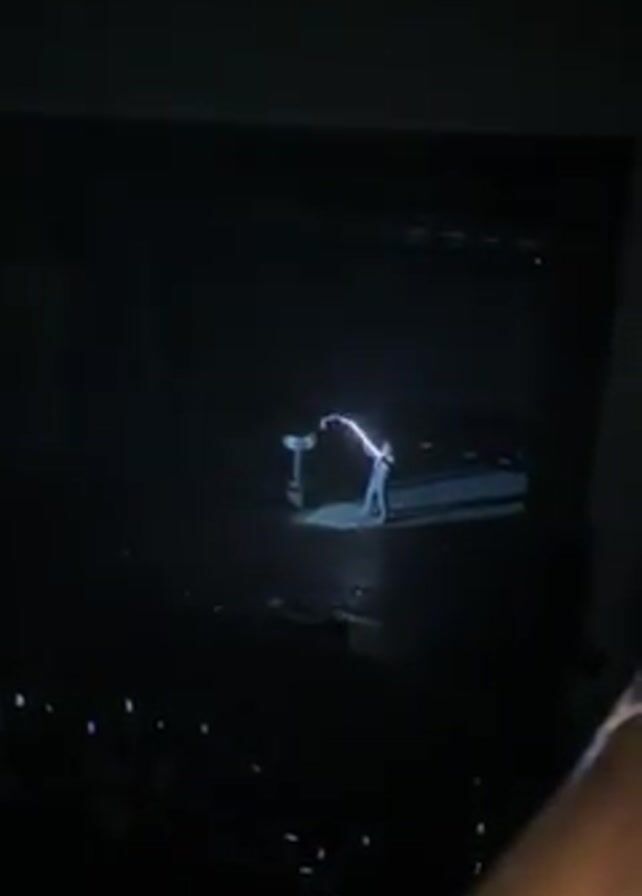 In a darkened room, a person in a full-body suit stands facing a Tesla coil