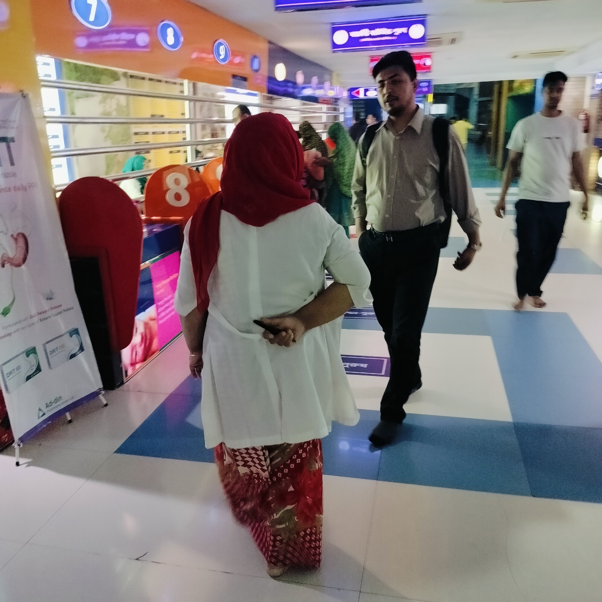 The image was taken in a public indoor space in Dhaka, Bangladesh, possibly a hospital waiting area, as indicated by the numbered seating arrangement with blue numbers (7, 8, 9) and an advertisement stand in the foreground for "DRT 50" pills. A woman wearing a red hijab, a white tunic, and a red patterned skirt is walking away from the camera. She is holding a smartphone behind her back. To her right, a man in a light brown button-down shirt, black pants, and dress shoes is walking toward the right. Another man is walking ahead of him, also to the right. Other people are present in the background. The floor is a white tile with blue stripes. Signage in Bangla is visible overhead.