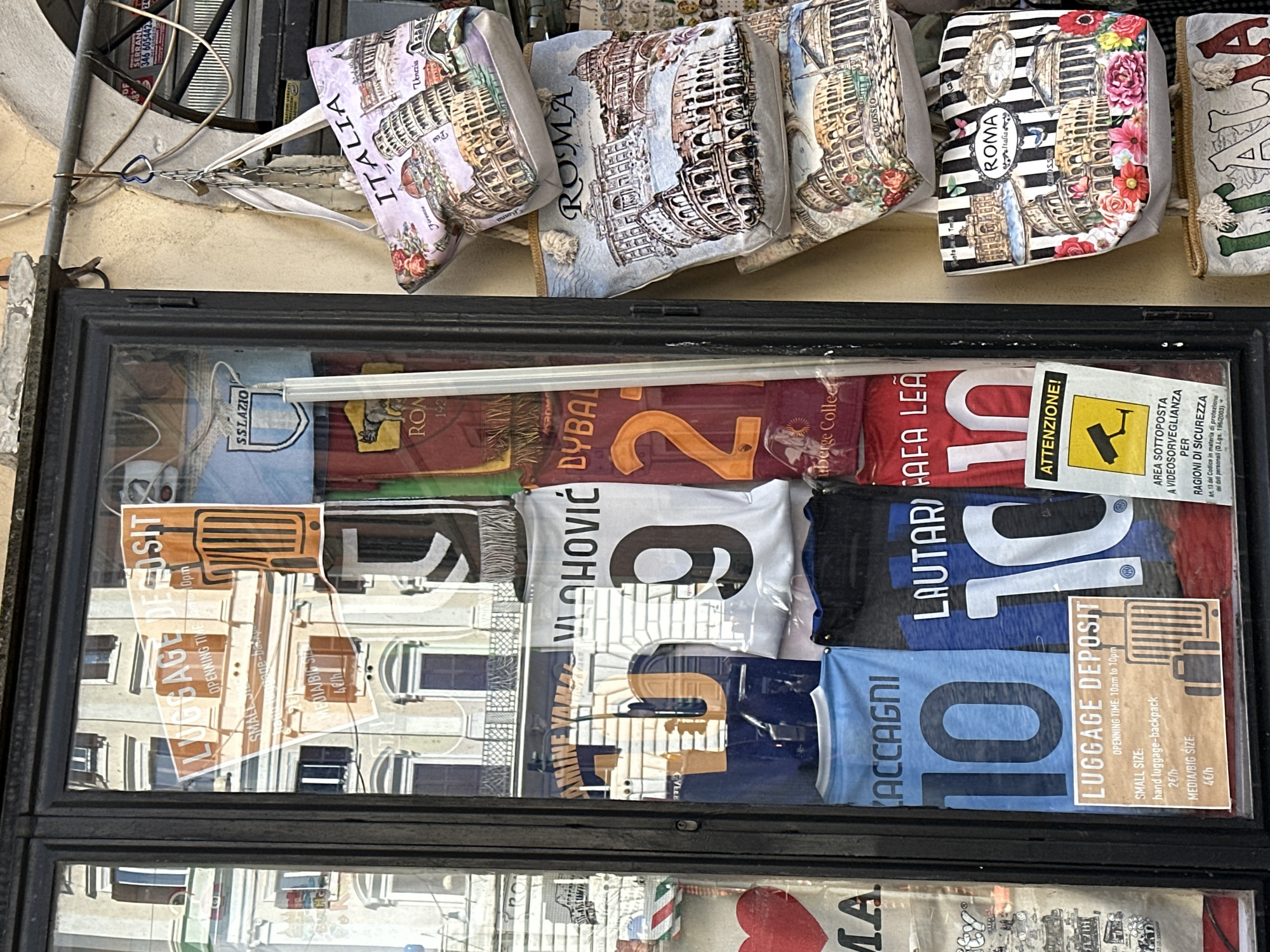 The scene depicts a commercial storefront located in Rome, Italy. On the left, a black-framed display window contains multiple soccer jerseys, including "VLAHOVIĆ #9," "DYBALA #21," "ZACCAGNI #10," "LAUTARO #10," and "RAFA LEÃO #10," alongside crests for SS Lazio and AS Roma (featuring a wolf). Two white signs are affixed to the interior of the glass: one advertises "LUGGAGE DEPOSIT" with "OPENNING TIME: 10am to 10pm" and rates of "2€/h" for small luggage and "4€/h" for medium/big size; the other, yellow and black, states "ATTENZIONE!" and "AREA SOTTOPOSTA VIDEOSORVEGLIANZA" (area under video surveillance) with a CCTV camera icon. Reflections in the window reveal a multi-story building across the street with light-colored walls, dark shutters, and balconies. On the right, against a light-colored stucco wall, multiple souvenir tote bags are hung from hooks and chains, including a blue heart-shaped carabiner. These bags feature printed illustrations of Italian landmarks such as Rome's Colosseum, Pantheon, and Trevi Fountain, as well as the Leaning Tower of Pisa and Venice canals. Text on the bags includes "ITALIA" and "ROMA." Electrical wiring is visible near the top right of the wall.