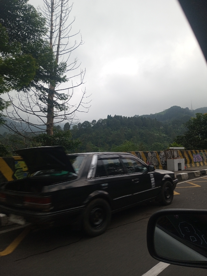 The image portrays an outdoor scene in Jabalpur, India, under an overcast sky. Densely forested hills or mountains form the background. In the midground, a black four-door sedan is observed on a paved road, positioned with its trunk lid open. The sedan has dark-tinted windows and white markings on its passenger-side front fender. The road features yellow and white pavement markings. Parallel to the road on the right is a concrete barrier, adorned with yellow and black diagonal stripes and multiple graffiti tags. A light-colored concrete structure is integrated into this barrier. A tall, largely defoliated tree stands on the left, next to other green foliage. The image is captured from within another vehicle, indicated by a car frame visible in the upper right and a side-view mirror in the lower right reflecting the black sedan and a white marking resembling the number '8'. No individuals are visible in the scene.