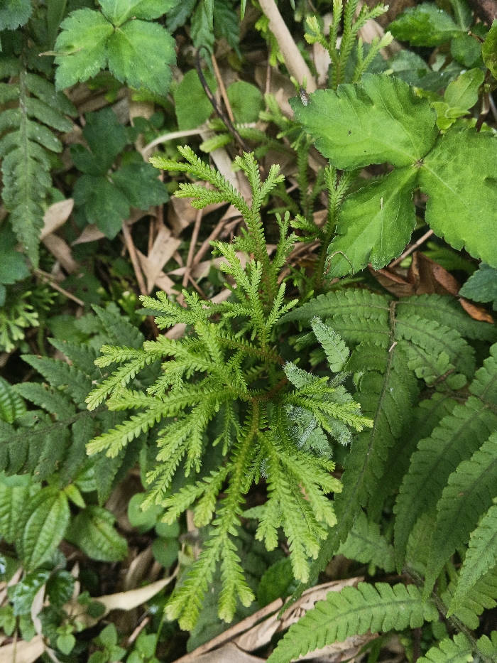 The image displays a close-up, downward-facing view of dense green foliage, consistent with an undergrowth environment in Tamghas, Nepal. The primary subject is a bright green, finely branched plant with numerous small, scale-like leaves, resembling a clubmoss or spike-moss, occupying the central and lower-left portions of the frame. To its left, a dark green fern frond with distinct pinnate leaflets is partially visible. To the upper right, a larger, broad green leaf with a smoother surface appears, and a small, dark-colored insect, possibly a fly, rests upon it. The background consists of further layers of green leaves, some out of focus, interspersed with fragmented brown, dried plant matter, suggesting leaf litter or decaying vegetation on the ground. No human subjects, explicit actions, or interactions beyond the insect resting on a leaf are present. The lighting is diffused, illuminating the foliage evenly.