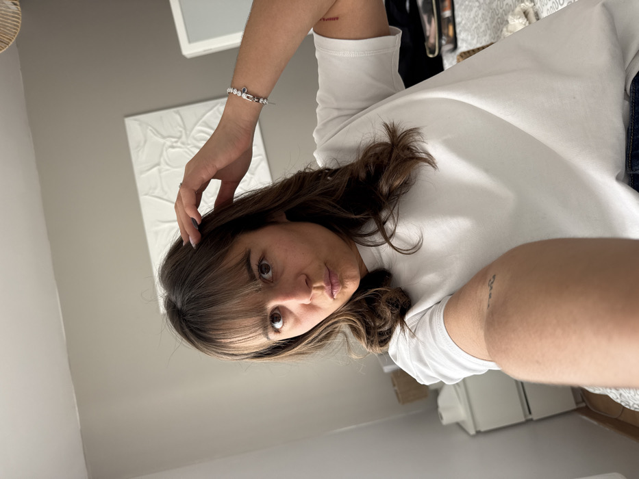 The scene depicts a female subject indoors, in what appears to be a residential room in Veauchette, France. No specific address or landmark within Veauchette is discernible. The subject is taking a selfie, extending her left arm forward while her right hand is positioned near her head, fingers touching her hair. She has brown, medium-length wavy hair with bangs, and visible lighter roots. Her eyes are dark and wide, looking directly at the camera, and her lips are pursed. She wears a white short-sleeved t-shirt. A silver-colored bracelet with clear stones and a small dark blue charm adorns her right wrist, and a silver-colored ring is on her left ring finger. A small red-inked tattoo is visible on her upper right arm, and a fainter dark tattoo is present on her left forearm. The background features light gray walls. A white, textured rectangular art piece is mounted on the wall to the right of the subject. To her left, a white two-drawer nightstand with a white object on its surface is visible. A patterned fabric, consistent with bedding, is partially visible in the lower portion of the frame.