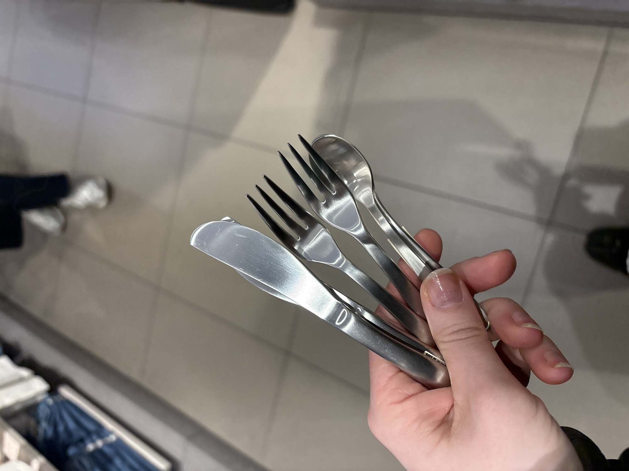 The image displays a close-up, first-person perspective of a fair-skinned hand grasping four pieces of stainless steel cutlery