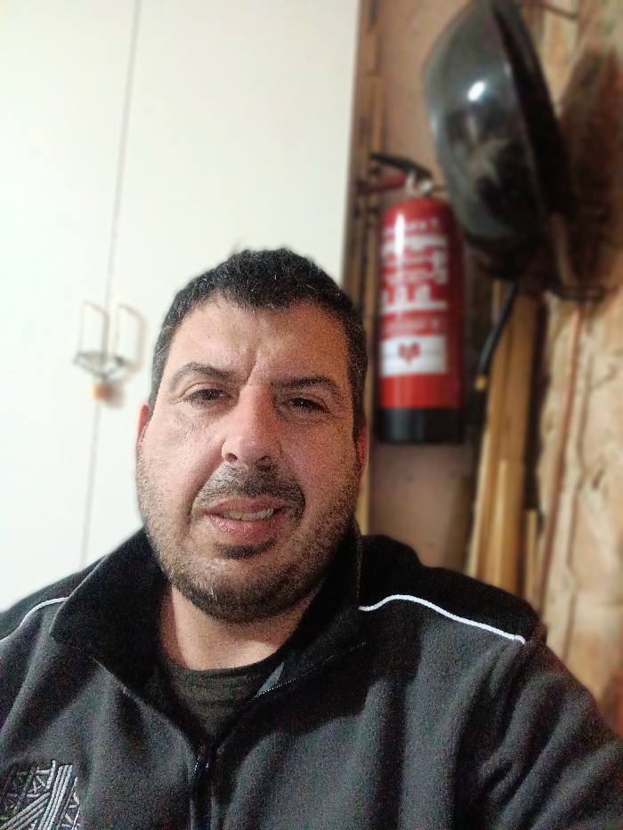 An adult male subject is depicted in a head-and-shoulders portrait. The man, appearing middle-aged, has dark, short hair and a full dark beard and mustache. He is looking directly at the camera with a slight smile. He wears a dark, zippered jacket with white trim across the shoulders, over a dark t-shirt. The background on the left features a plain, light-colored wall, with a blurred, light-colored object, possibly a bracket or fixture, visible in the upper left. The background on the right is a textured wall against which a red fire extinguisher is mounted. The extinguisher bears a white label with a red heart icon. Above and to the right of the extinguisher, a dark, dome-shaped object, possibly a hard hat or helmet, is hanging. Further to the right and behind the subject's right shoulder, vertically stacked wooden materials or planks are visible. The environment suggests an indoor utility space or workshop. The specific location within Montorio, Spain, is not discernible from the visual evidence.