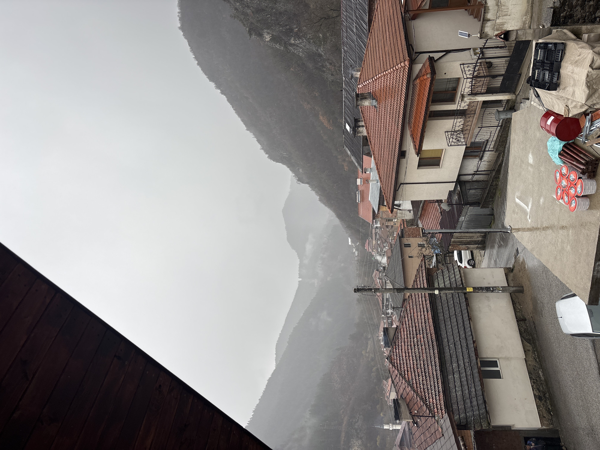 An elevated viewpoint captures a residential section of Grohotno, Bulgaria, on an overcast, possibly rainy day. The scene is dominated by a valley surrounded by steep, mist-shrouded, tree-covered mountains in the background. In the immediate foreground, to the upper left, a dark brown wooden eaves structure is partially visible. To the lower right, a concrete ledge or balcony floor holds several items: eight red and white lidded buckets, a red metal drum, bundles of dark wooden or metal rods, a black plastic crate, and a beige tarp covering other objects. The midground features a dense arrangement of residential buildings with various tiled roofs, predominantly red-orange and some darker grey. Most houses are light-colored (beige or white stucco). A wet asphalt street winds through the neighborhood, indicating recent precipitation. A white hatchback is partially visible on the street in the lower left, and a white SUV is parked further up the street. Multiple dark utility poles with wires run along the street. Two individuals are visible standing near the entrance of a light-colored building with a dark-tiled roof in the lower-middle left. In the mid-right, a multi-story house with a beige facade features a prominent balcony with ornate black railings and a red-tiled awning. A small solar panel is mounted on a pole beside this house. In the far left midground, above the rooftops, a slender white minaret with a conical roof is visible, suggesting the presence of a mosque. The overall environment conveys a mountainous village setting with a significant residential presence.