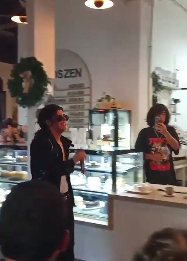 Michael Jackson impersonator performing in what appears to be a cafe or restaurant. The impersonator is wearing a black jacket, white t-shirt, black pants, and sunglasses. He is holding a microphone and singing while walking around the room. The background includes a menu board, display cases with food items, tables with people seated, and a heater. There are a few people watching the performance. One person behind the counter is recording the performance on a phone. The location appears to be decorated for the holidays, with a wreath hanging on a pillar.