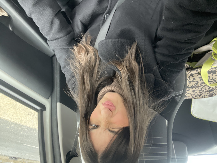 A young woman is seated in the front passenger seat of a vehicle, secured by a dark-colored seatbelt across her chest and left shoulder. She has long, straight dark brown hair and is wearing a black long-sleeved coat over a light brown or beige turtleneck sweater. Her face is directed towards the viewer, making a playful expression characterized by a closed left eye, a wide-open right eye with furrowed brow, and pursed lips forming a "fish face." A faint blush is visible on her cheeks. Behind her, a dark grey or black car seat with white stitching is partially visible. On the seat next to her, a light-colored bag with a dark scroll pattern and a bright lime green strap is visible. Through the vehicle's window on the right, an outdoor environment is depicted with a blurred light-colored ground surface, possibly a roadside shoulder, and a faint white line suggesting a road marking. The background lacks specific identifying landmarks. The image does not contain sufficient visual data to identify a precise location within the city of Montpellier, France.