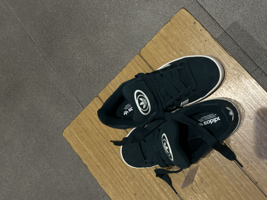 - "A pair of dark blue Adidas sneakers with white trim sit on a light brown wooden surface, adjacent to a gray tiled floor" by FM-uHQrE3, licensed under CC BY 4.0