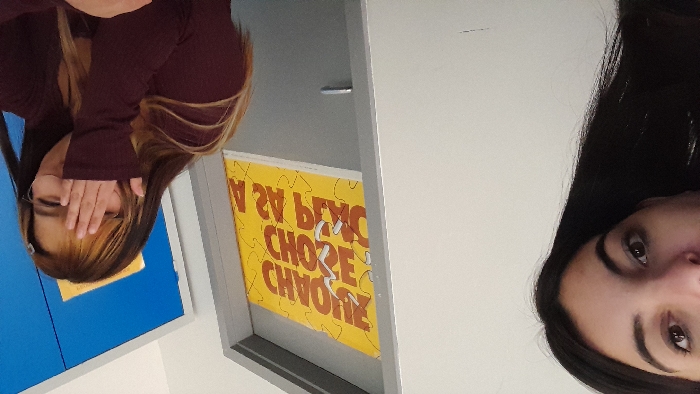 This indoor image, captured in Schiltigheim, France, features two individuals. On the left, the upper-left quadrant of a person's face is visible, displaying dark hair and dark eyes directed towards the camera. On the right, a second individual with long, dark and blonde streaked hair, wearing glasses and a maroon long-sleeved shirt, covers the lower part of their face with their left hand while smiling. The background consists of a white wall on the left, a grey doorframe, and a blue door on the right. A yellow sign, bearing mirrored red text "CHAQUE CHOSE À SA PLACE" (Every thing in its place) with a jigsaw puzzle motif, is affixed within the doorframe. A smaller yellow tag is attached to the blue door.