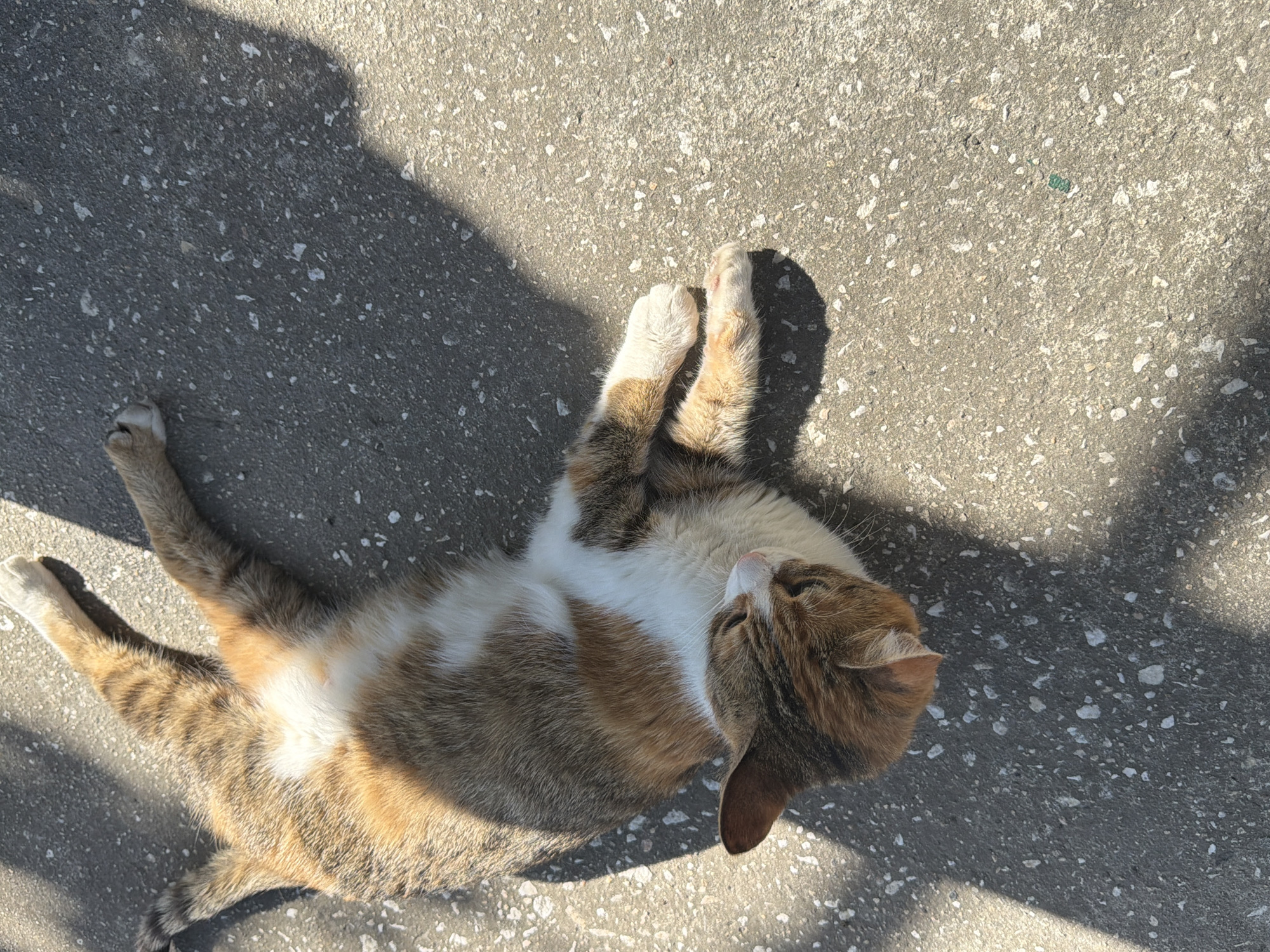 A calico cat is lying on a concrete surface. The cat is positioned on its back with its paws extended upwards. The cat's fur is a mix of brown, white, and black. The ground appears to be a paved surface, possibly a sidewalk or road. Shadows are cast across the surface, indicating sunlight. The scene is outdoors, likely in an urban environment. The location, Trivoditsi, Bulgaria, is not visually discernible in the image.