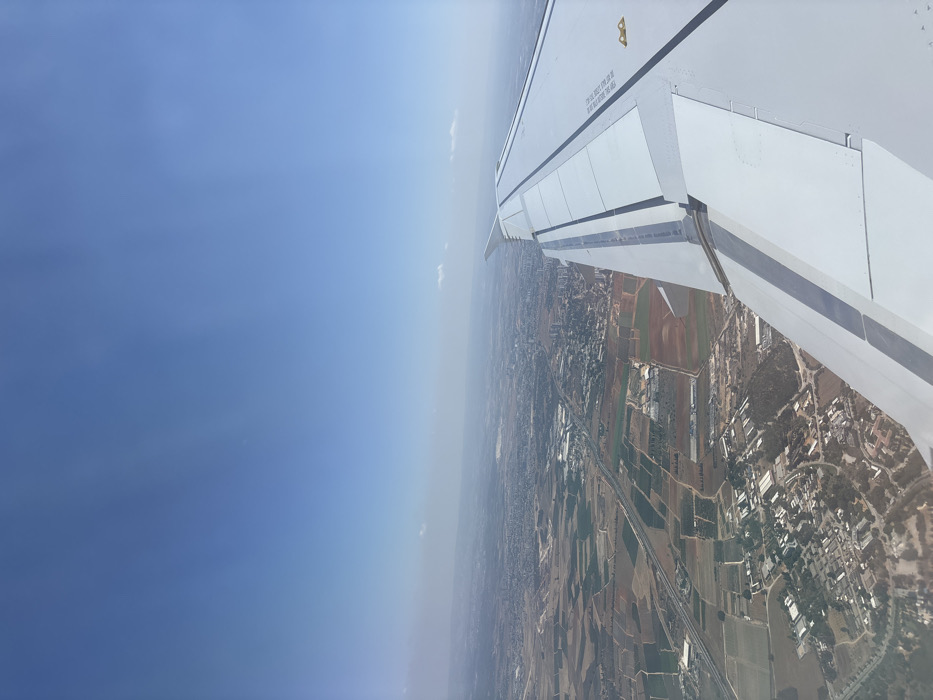 - "An aerial photograph taken from an aircraft window shows a wide expanse of land within the Sdot Dan Regional Council, Israel, under a clear, bright blue sky with minimal atmospheric haze and a few wispy white clouds near the distant horizon" by FM-mfRp53, licensed under CC BY 4.0