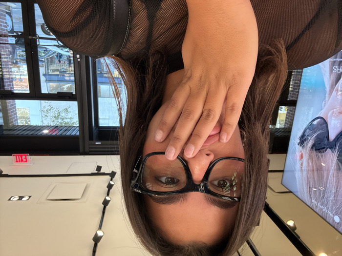 An image captured from a first-person perspective depicts a female individual inside a retail store, identified as Sunglass Hut, located at 1531 Walnut Street in Philadelphia, Pennsylvania. The primary subject is a woman with dark brown hair, wearing large black-framed eyeglasses. She is looking directly at the camera. Her right hand is raised, covering the lower half of her face from just below her nose to her chin, with her fingers positioned over her lips. She is dressed in a black mesh long-sleeve top, under which a black bra is visible. To the immediate left of the subject, a large vertical digital display is visible, featuring an advertisement for "sunglass hut." The ad shows a person with blond hair wearing dark sunglasses. The background reveals the interior of the store, characterized by a white ceiling fitted with black track lighting fixtures. Above the exit, a red illuminated "EXIT" sign is visible. Large glass doors and windows span the right side of the frame, offering a view of the exterior urban environment. Outside, a street scene unfolds, featuring a brick building with multiple windows, glimpses of tree foliage, and a white vehicle parked or moving on the street. Another commercial storefront with a blue awning is faintly visible across the street.