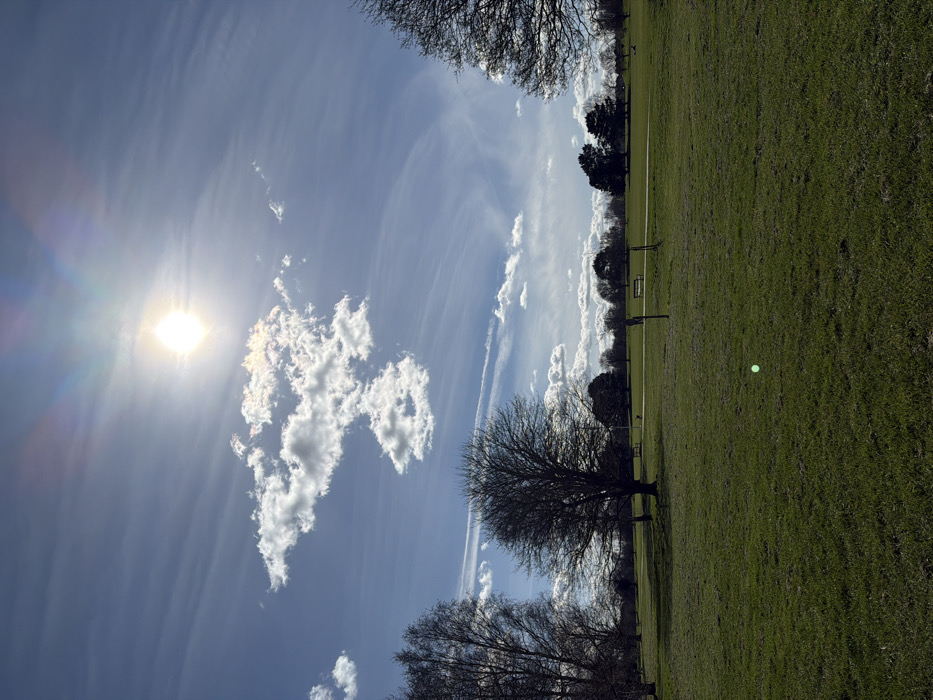 The image displays a wide-angle view of a large, open public park in Maidstone, United Kingdom, captured on a sunny day. The sky, occupying the upper half of the frame, is predominantly clear blue, featuring a bright, radiant sun positioned in the upper-center, producing a visible lens flare with radial light streaks and subtle rainbow spectral colors. A distinct, irregularly shaped cumulus cloud with iridescent edges is located in the upper-left quadrant, with additional smaller cumulus clouds and wispy cirrus formations scattered across the sky. The lower half to two-thirds of the image is dominated by an expansive, well-maintained green grassy field. Numerous deciduous trees are visible throughout the scene, mostly bare of leaves, indicating late winter or early spring. A cluster of slender trees stands along the left edge, while a larger, darker-barked tree with a prominent, round canopy is centrally located in the mid-ground. Another bare tree extends into the frame from the right edge. A distant tree line forms the horizon. A light-colored path or track curves through the grassy area in the mid-ground, leading towards the background, slightly right of the frame's center. Several dark-colored park benches are positioned along this path and within the grass in the mid-distance. Two slender, dark poles are visible upright in the mid-ground, situated to the right of the central large tree, near the path. One human subject, appearing as a dark silhouette, is observed walking along the path in the mid-distance, to the right of the central large tree. No other individuals or specific interactions are discernible. A small, bright green circular artifact is present on the grass in the lower-mid foreground.