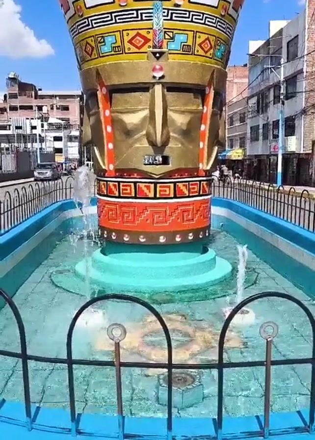 fountain with a sculpture in the middle, in a city street. The sculpture consists of a golden face with an intricate headdress in shades of orange, white, yellow and black, sitting on top of a base with an orange pattern. The fountain's basin is painted turquoise, with a black and bronze-colored metal fence surrounding it. Jets of water are spraying inside the fountain. In the background are buildings, cars, and utility poles. The sky is blue with some clouds.