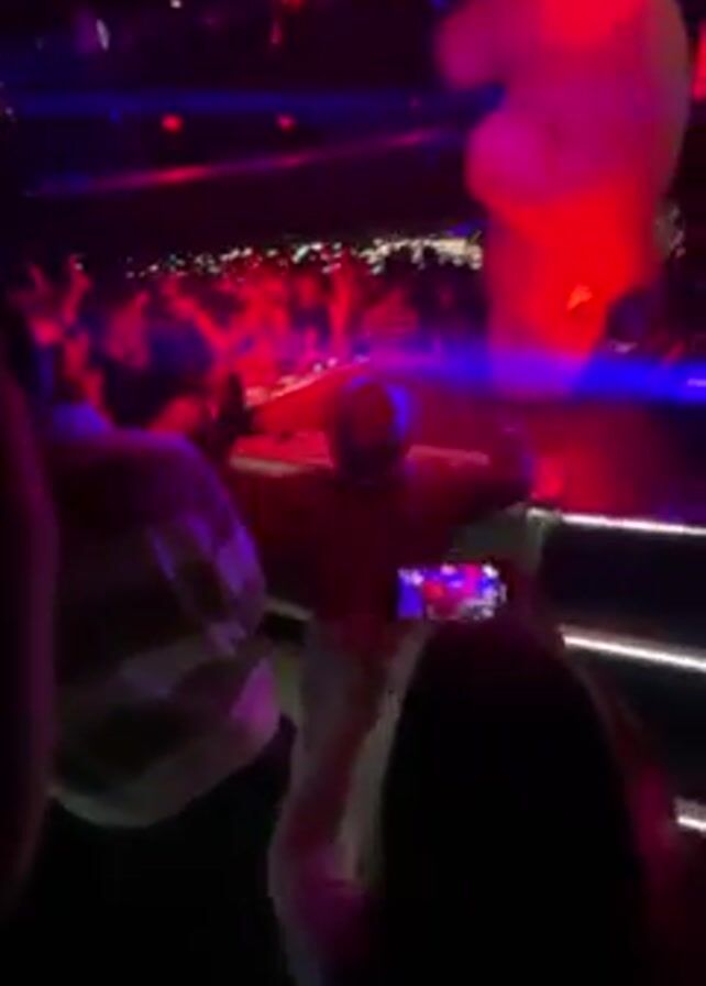 crowded indoor club with flashing red and blue lights. People are dancing and recording with their phones. A person in a red shirt and light pants is dancing on a slightly elevated platform. There is a lit staircase to the side. A large inflatable is being bounced around in the crowd.