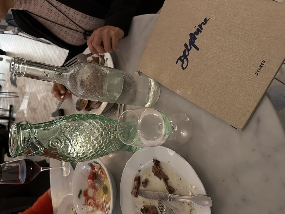This image depicts a dining table scene at Delphine restaurant, located at Vesterbrogade 40, 1620 København V, Copenhagen, Denmark. The table features a white marble surface. In the foreground, a beige menu with "Delphine" printed in dark script and "DINNER" below it lies flat. To its left, a clear stemmed glass contains a small amount of water, positioned next to a clear glass bottle with condensation, containing water. Above these, a white plate holds several small remnants of cooked meat and a silver knife and fork. Further left, a white bowl contains discarded salad elements including red tomatoes and green leaves, with a fork resting inside. Centrally, a prominent green glass carafe shaped like a fish stands, appearing mostly empty. Two individuals are partially visible. On the far left, a person's arm with an orange sleeve is next to a wine glass containing red liquid. On the right, a person is seated, wearing a light-colored, high-necked, textured top under a dark blazer. Their right hand holds a silver fork over a white plate containing some remaining food, while their left hand is partially visible resting on the table. The background shows blurred restaurant elements, including geometric patterned flooring.