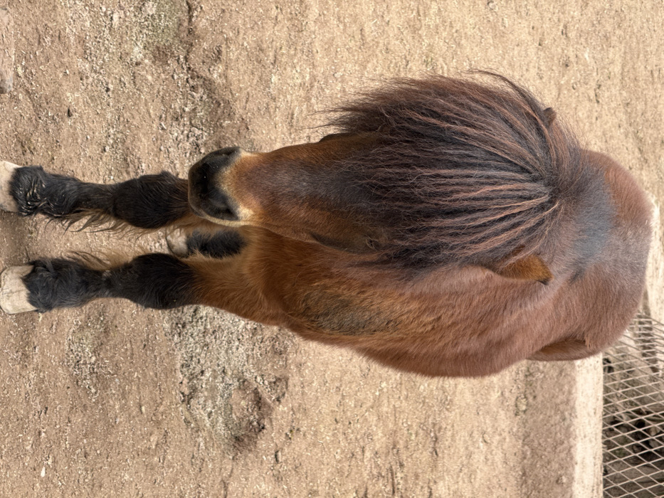 An overhead shot displays a small, brown horse with a thick, dark mane. Its legs are black with white markings on the hooves, and it's standing on a sandy, dirt-covered surface. Part of a wire fence is visible in the background. The horse appears relaxed, with its head slightly turned.