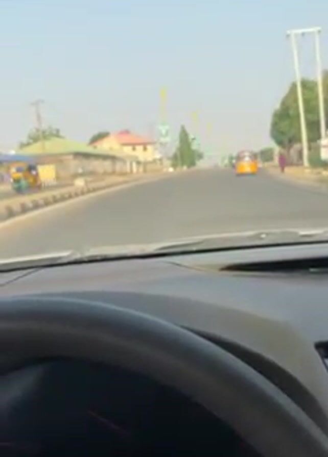 A car is moving on a smooth road in a daytime setting. The road has black and white curbs on both sides. Some buildings, trees, and electric poles are visible on either side of the road. The car's dashboard and steering wheel are visible. A yellow-painted vehicle, potentially a taxi, is moving in the distance on the same road.