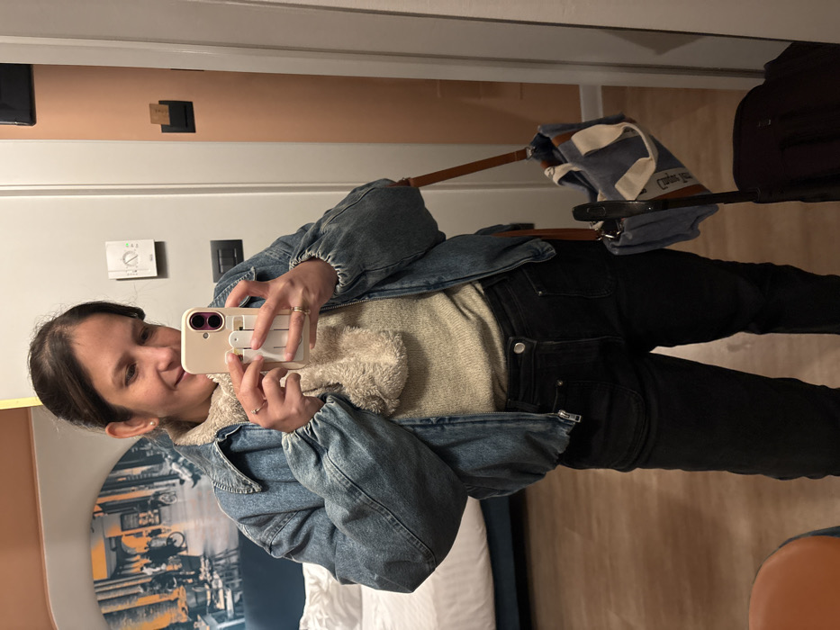 A woman in a denim jacket and dark jeans stands in a hotel room, taking a selfie