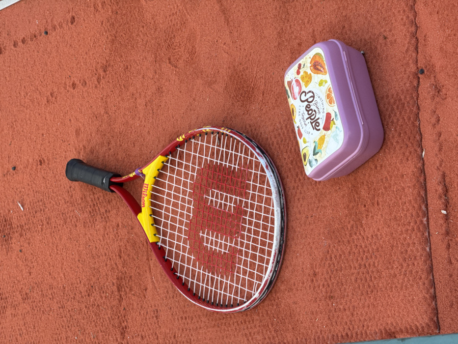 A red and yellow Wilson tennis racket lies on a reddish-brown surface. To the right of the racket is a rectangular, light purple container adorned with colorful fruit designs and the word "People." The surface appears to be a tennis court. The racket is positioned diagonally, with its handle on the left side of the frame.