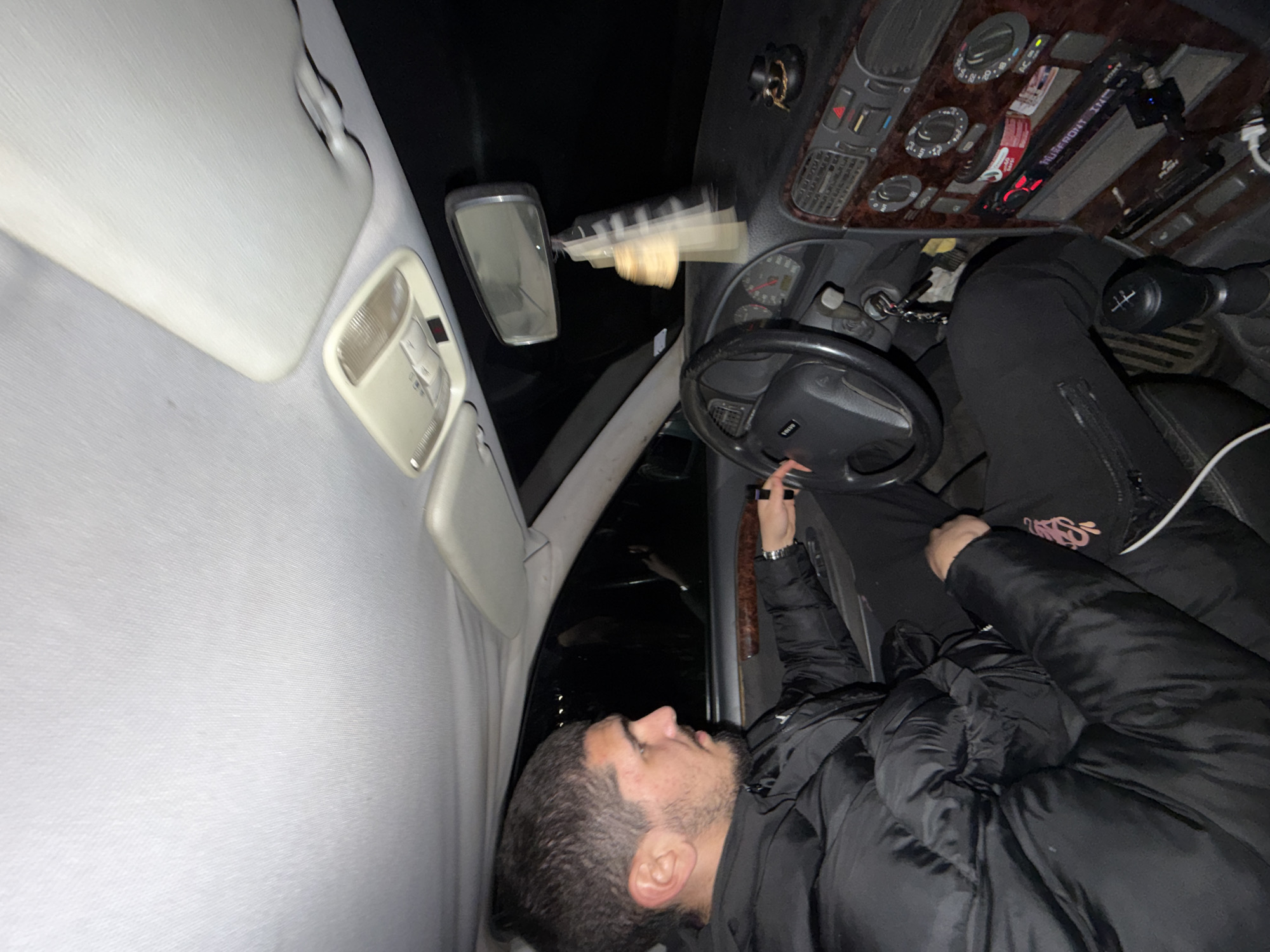 A man is lying in the driver's seat of a car. He is wearing a black jacket and black pants. His hand is on the steering wheel. The car interior shows the dashboard, rearview mirror, and overhead light. The location is potentially Valchedram, Bulgaria, but this cannot be confirmed from the image itself. The scene is dark.