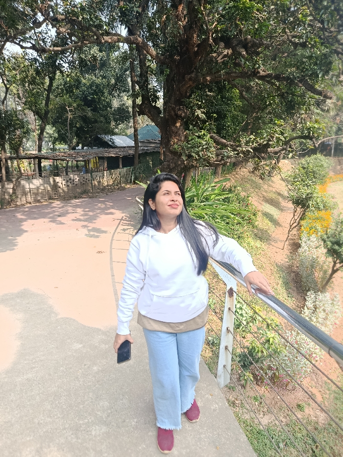 A woman wearing a white hoodie, blue jeans, and maroon shoes walks along a concrete path in a park. She holds a phone in her left hand and rests her right hand on a metal railing. Lush greenery, including trees and plants, surrounds the path. A building with a metal roof is visible in the background. The woman gazes upwards, towards the trees.