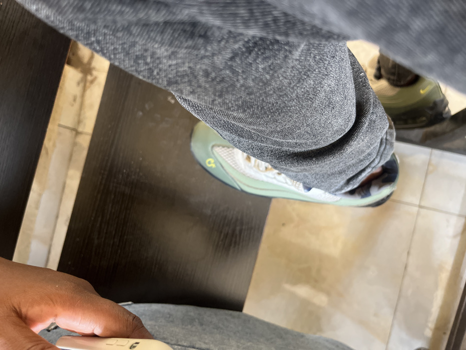 An overhead view captures the lower half of an individual seated in an indoor setting within the city of Lagos, Nigeria. The subject's left hand, visible on the far left, holds a white smartphone. The left thigh is clad in light blue-grey denim jeans. Directly below, a dark brown wooden surface, likely a table or desk, extends horizontally across the frame. Beneath this surface, the subject's right leg is covered in dark grey denim jeans, with a light green and white sneaker, featuring a yellow Omega (Ω) symbol near the toe, on the right foot. A second, darker shoe, possibly the left foot's, is partially visible in the lower right corner. The floor consists of light-colored, possibly beige or off-white, square tiles.